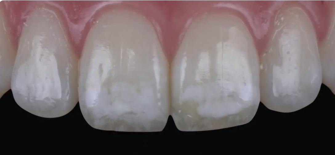• نشانهها: این لکهها معمولاً به صورت گچی یا مات دیده میشوند و بیشتر در نزدیکی خط لثه یا روی دندانهای جلویی ظاهر میشوند.